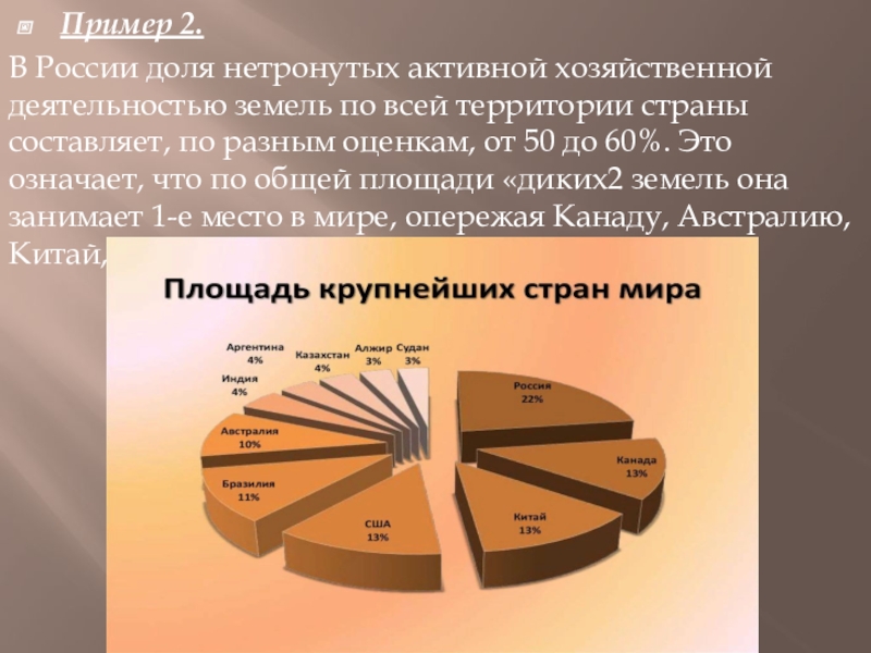 территории страны составляет, по разным оценкам, от 50 до 60%. Это означает, что по общей площади «диких2 земель она занимает 1-е место в мире, опережая Канаду, Австралию, Китай, Бразилию.