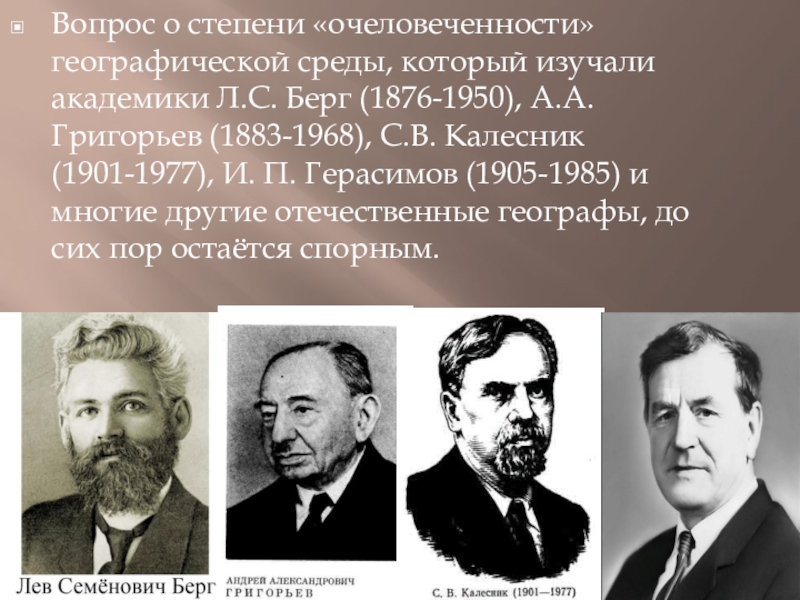 Слайд 8Вопрос о степени «очеловеченности» географической среды, который изучали академики Л.С. Берг