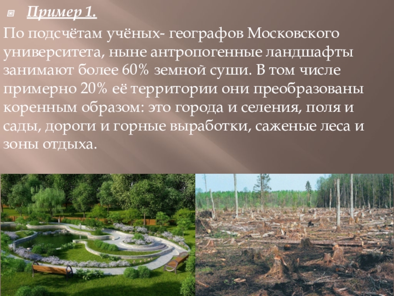 По подсчётам учёных- географов Московского университета, ныне антропогенные ландшафты занимают