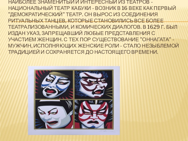 Слайд 41НАИБОЛЕЕ ЗНАМЕНИТЫЙ И ИНТЕРЕСНЫЙ ИЗ ТЕАТРОВ - НАЦИОНАЛЬНЫЙ ТЕАТР КАБУКИ -