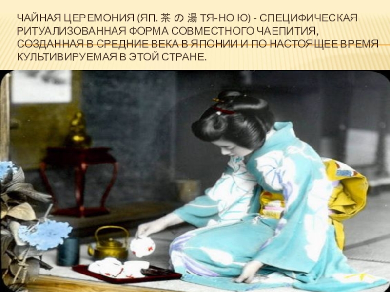 Слайд 50ЧАЙНАЯ ЦЕРЕМОНИЯ (ЯП. 茶 の 湯 ТЯ-НО Ю) - СПЕЦИФИЧЕСКАЯ РИТУАЛИЗОВАННАЯ