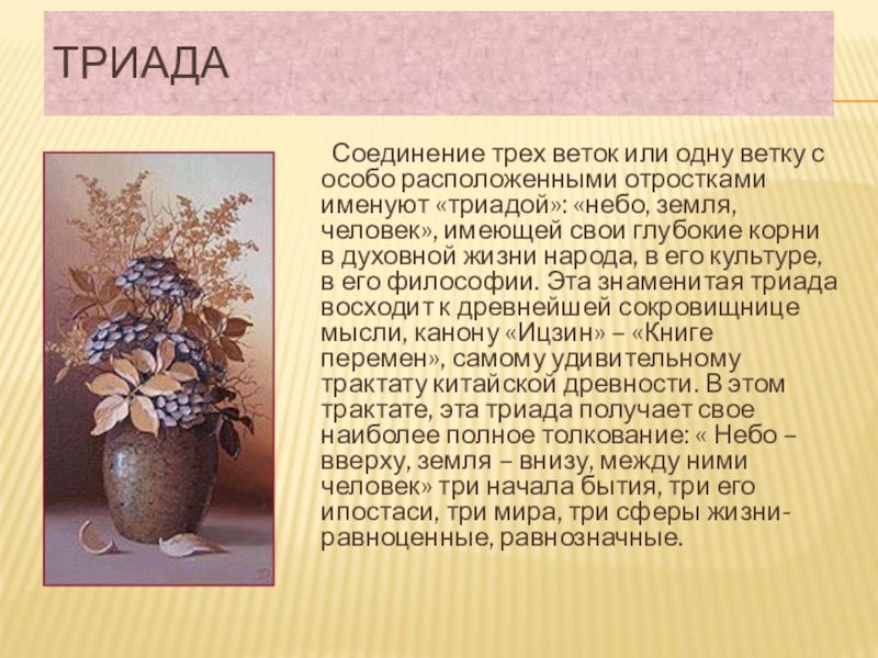 «триадой»: «небо, земля, человек», имеющей свои глубокие корни в духовной жизни народа, в его культуре, в его философии. Эта знаменитая триада восходит к древнейшей сокровищнице мысли, канону «Ицзин» – «Книге перемен», самому удивительному трактату китайской древности. В этом трактате, эта триада получает свое наиболее полное толкование: « Небо –вверху, земля – внизу, между ними человек» три начала бытия, три его ипостаси, три мира, три сферы жизни- равноценные, равнозначные.