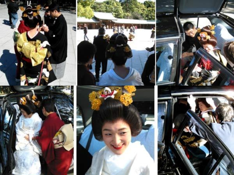 Японские свадебные церемонии, по сравнению с западными, экстравагантны и дороги, они предусматривают большие приемы, которые дополняются демонстрацией нарядов. Во время церемонии жених одет в формальное кимоно с фамильными гербами. Невеста одета в белое кимоно и в белую шелковую косынку с красной подкладкой (цунокакуси). По обычаю, жених и невеста меняют наряд два или три раза во время приема.