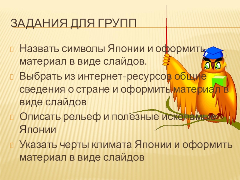 Назвать символы Японии и оформить материал в виде слайдов.