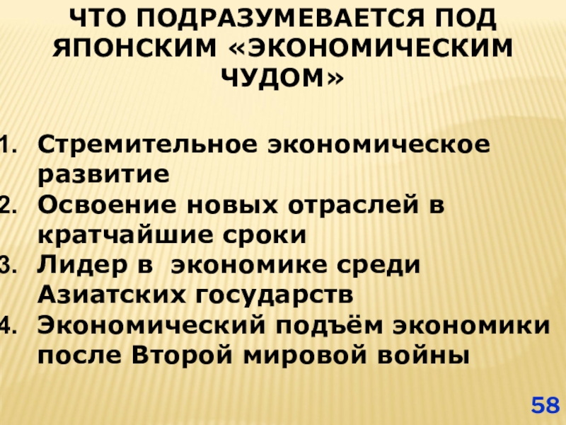 Слайд 58ЧТО ПОДРАЗУМЕВАЕТСЯ ПОД ЯПОНСКИМ «ЭКОНОМИЧЕСКИМ ЧУДОМ»