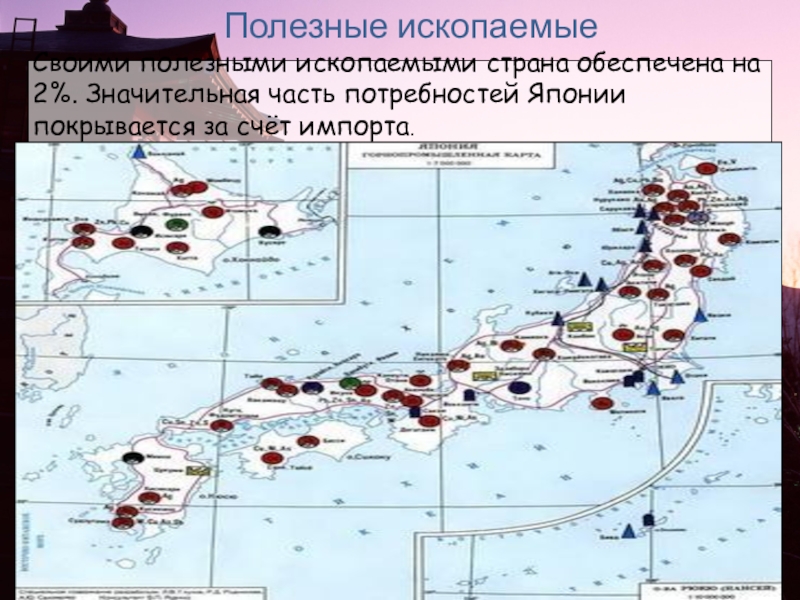 Описать рельеф и полезные ископамые Японии