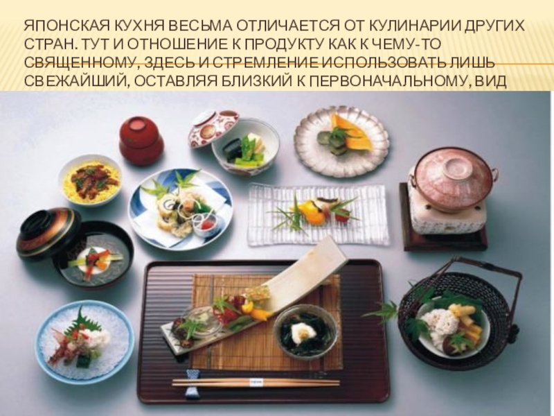 Слайд 47ЯПОНСКАЯ КУХНЯ ВЕСЬМА ОТЛИЧАЕТСЯ ОТ КУЛИНАРИИ ДРУГИХ СТРАН. ТУТ И ОТНОШЕНИЕ