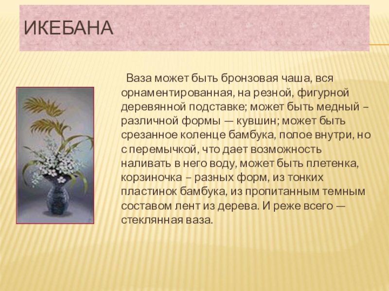подставке; может быть медный – различной формы — кувшин; может быть срезанное коленце бамбука, полое внутри, но с перемычкой, что дает возможность наливать в него воду, может быть плетенка, корзиночка – разных форм, из тонких пластинок бамбука, из пропитанным темным составом лент из дерева. И реже всего — стеклянная ваза.