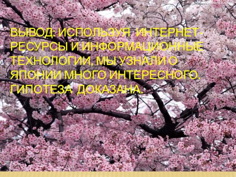 Слайд 14ВЫВОД: ИСПОЛЬЗУЯ ИНТЕРНЕТ-РЕСУРСЫ И ИНФОРМАЦИОННЫЕ ТЕХНОЛОГИИ, МЫ УЗНАЛИ О ЯПОНИИ МНОГО