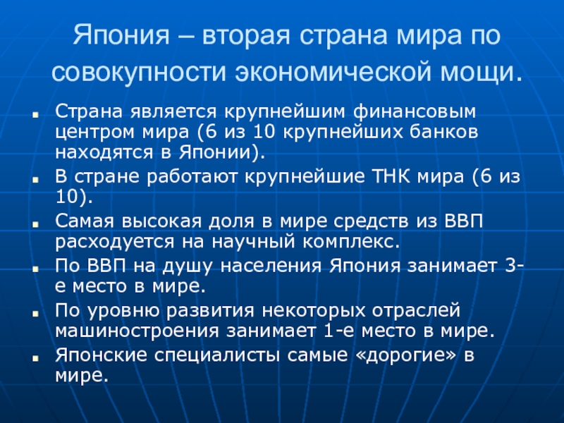 Слайд 21Япония – вторая страна мира по совокупности экономической мощи.