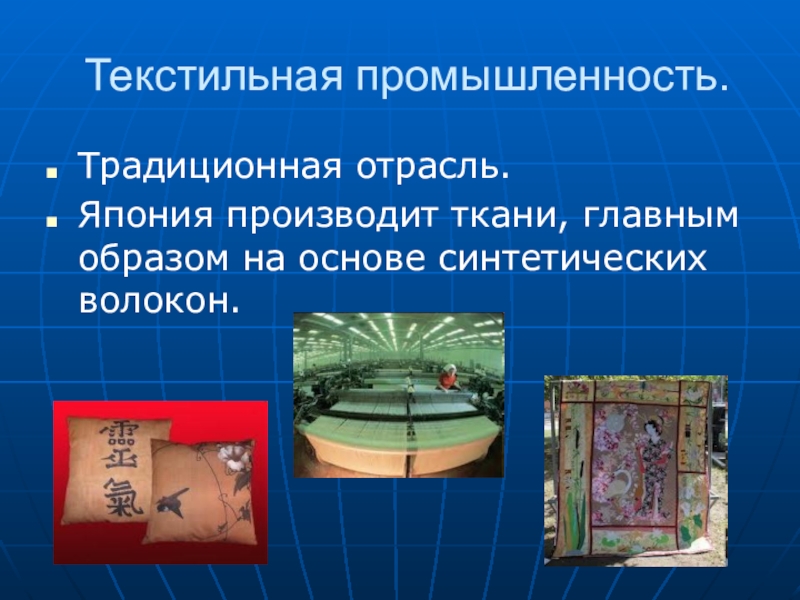 Япония производит ткани, главным образом на основе синтетических волокон.