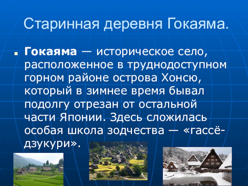 который в зимнее время бывал подолгу отрезан от остальной части Японии. Здесь сложилась особая школа зодчества — «гассё-дзукури».