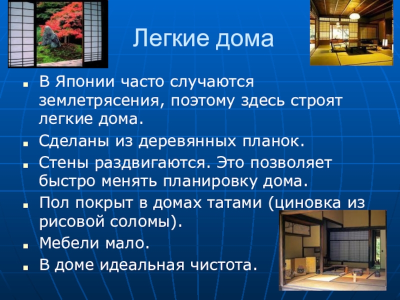 В Японии часто случаются землетрясения, поэтому здесь строят легкие дома.