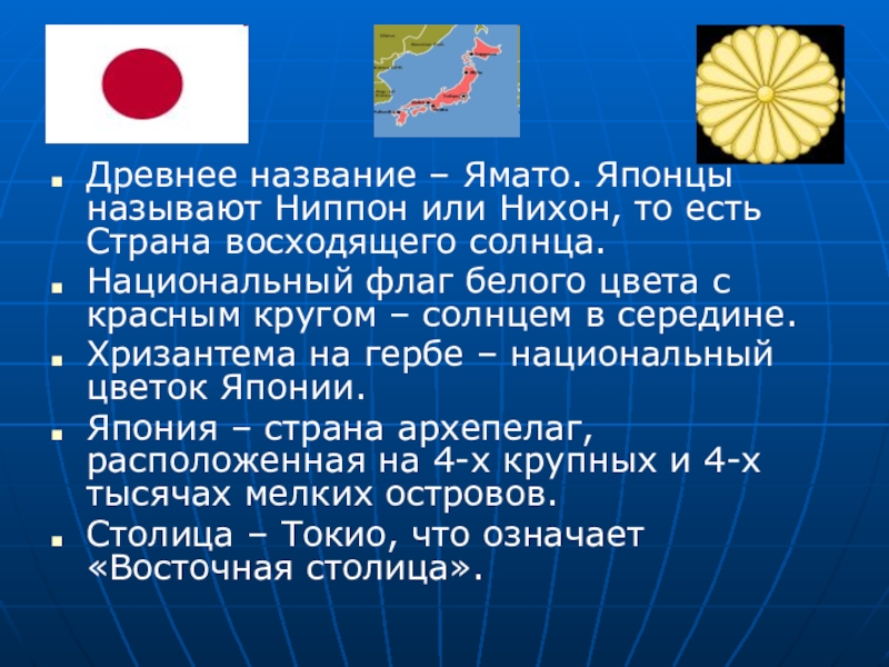 Древнее название – Ямато. Японцы называют Ниппон или Нихон, то есть