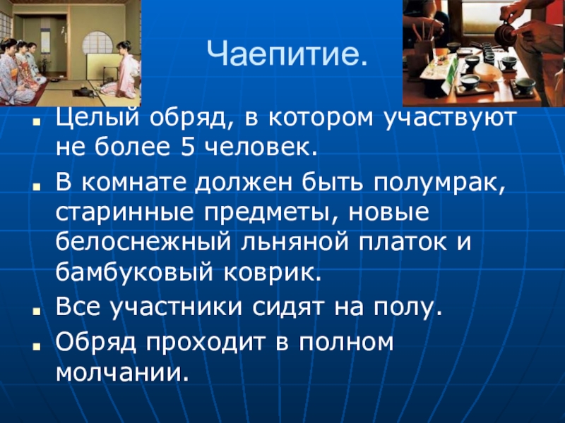 быть полумрак, старинные предметы, новые белоснежный льняной платок и бамбуковый коврик.