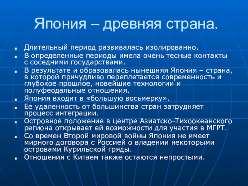 В результате и образовалась нынешняя Япония – страна, в которой причудливо переплетается современность и глубокое прошлое, новейшие технологии и полуфеодальные отношения.