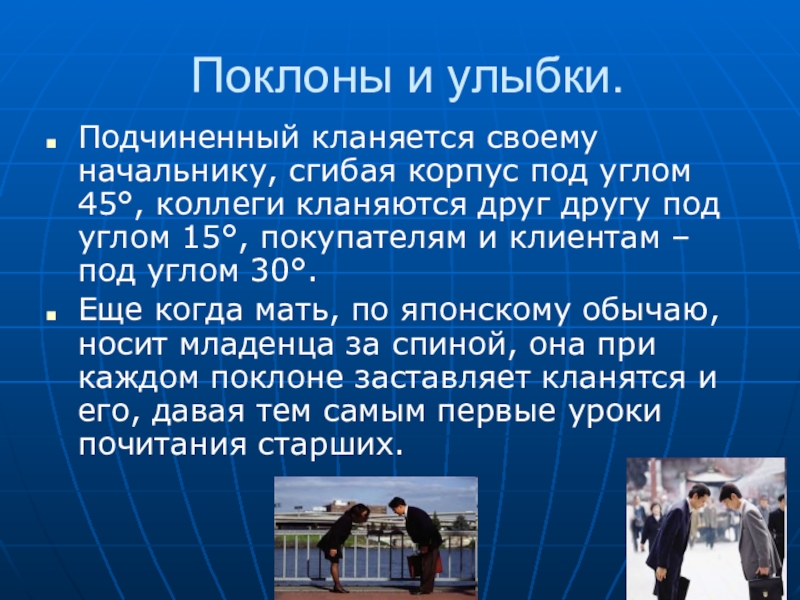 коллеги кланяются друг другу под углом 15°, покупателям и клиентам – под углом 30°.