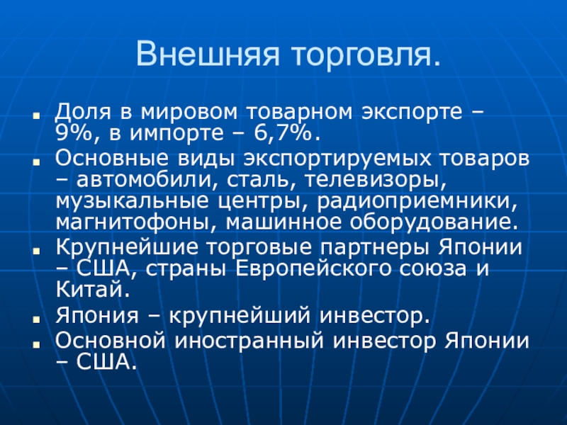 Крупнейшие торговые партнеры Японии – США, страны Европейского союза и Китай.
