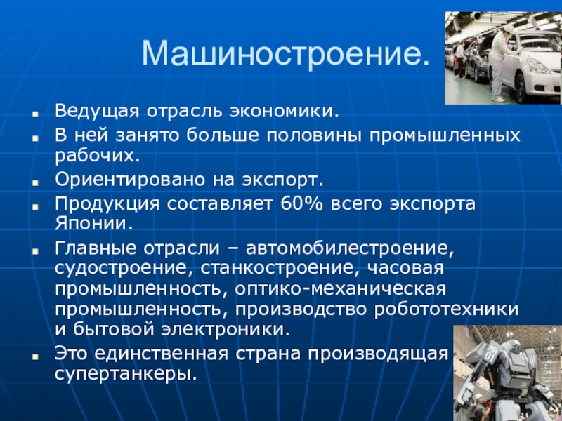 По уровню развития некоторых отраслей машиностроения занимает 1-е место в мире.