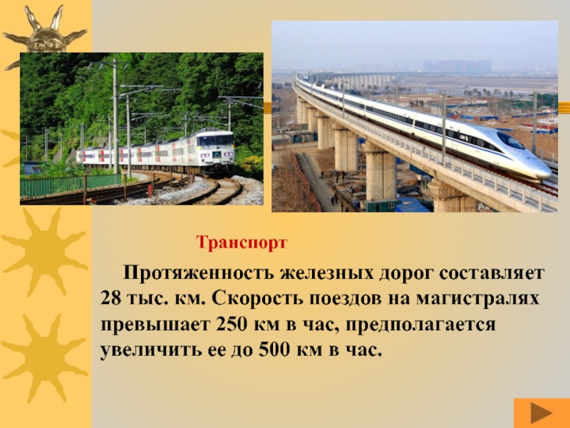 Слайд 55Протяженность железных дорог составляет 28 тыс. км. Скорость поездов на магистралях