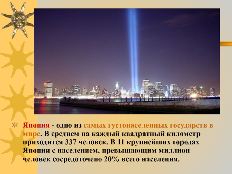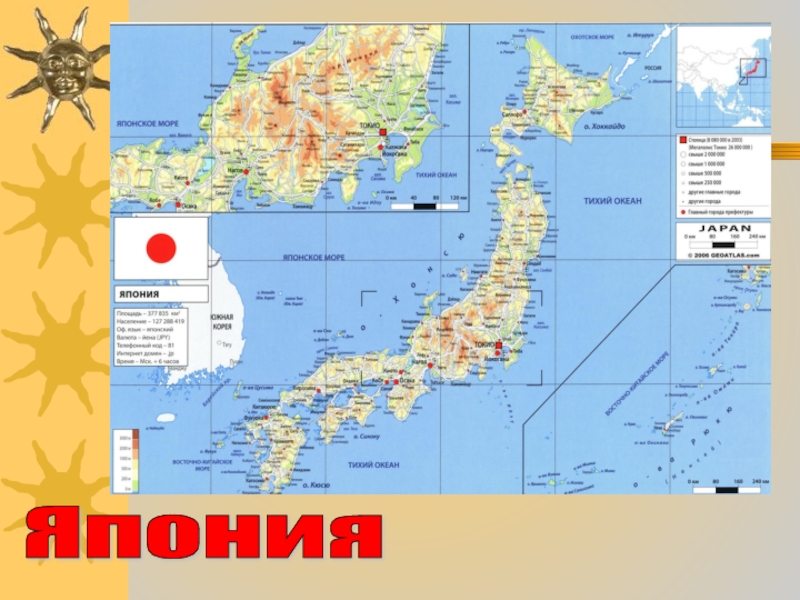 Япония — островное государство, огибающее восточную часть Азии. Основана в 660 г. до н.э. Общая территория составляет 377.944 км2