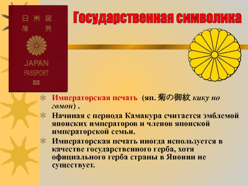 Слайд 8Императорская печать (яп. 菊の御紋 кику но гомон) .