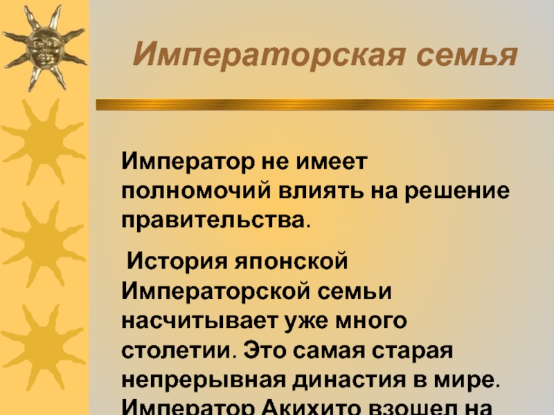 Императорской семьи насчитывает уже много столетии. Это самая старая непрерывная династия в мире. Император Акихито взошел на трон в 1989г. У него и его жены, Императрицы Мичико, трое детей.