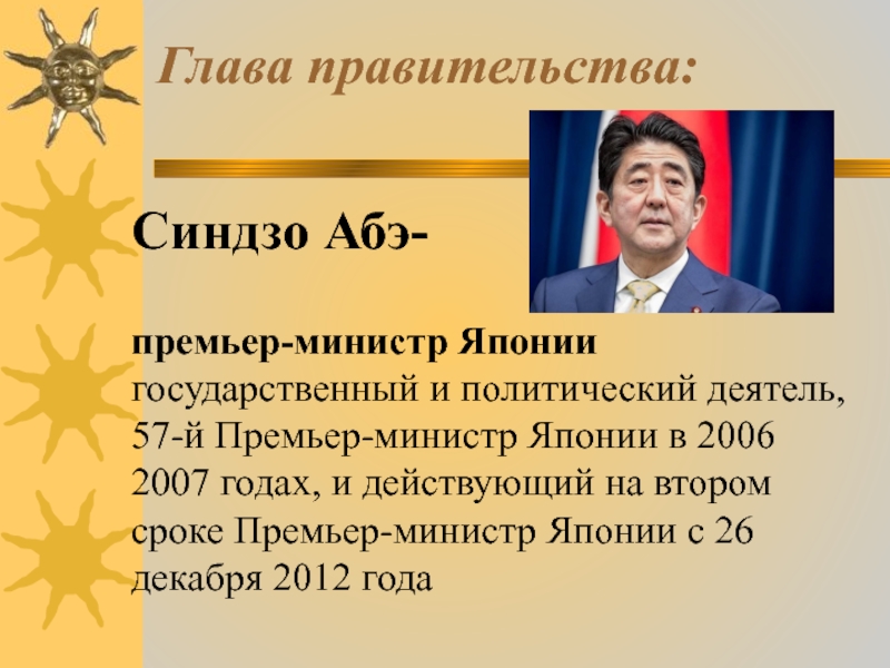 премьер – министр. Высший орган государственной власти и единственный орган законодательной власти – парламент, состоящий из двух палат: палаты представителей и палаты советников.