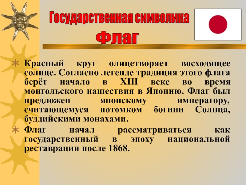 Слайд 7Красный круг олицетворяет восходящее солнце. Согласно легенде традиция этого флага берёт