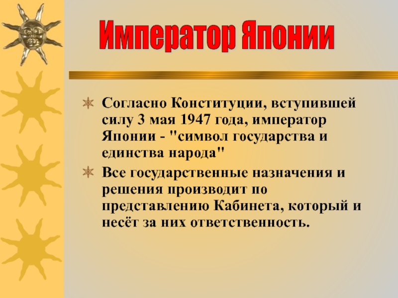 Слайд 18Согласно Конституции, вступившей силу 3 мая 1947 года, император Японии -