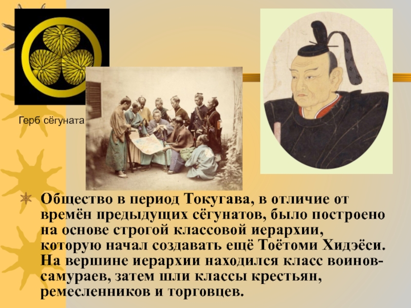 построено на основе строгой классовой иерархии, которую начал создавать ещё Тоётоми Хидэёси. На вершине иерархии находился класс воинов-самураев, затем шли классы крестьян, ремесленников и торговцев.
