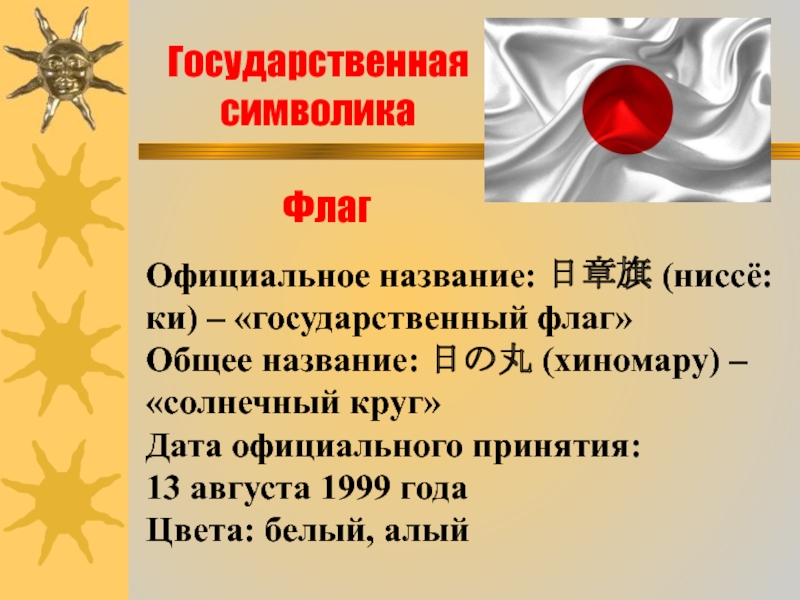 Слайд 6Официальное название: 日章旗 (ниссё:ки) – «государственный флаг»