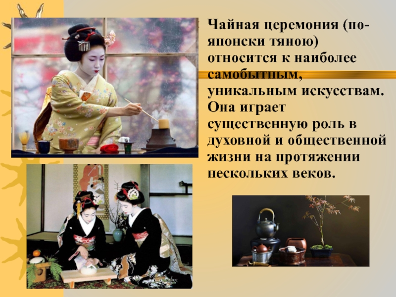 Слайд 68Чайная церемония (по-японски тяною) относится к наиболее самобытным, уникальным искусствам. Она