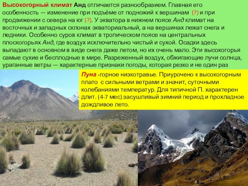 Пуна -горное низкотравье. Приурочено к высокогорным плато с сильными ветрами и значит, суточными колебаниями температур. Для типичной П. характерен длит. (4-7 мес) засушливый зимний период и прохладное дождливое лето.