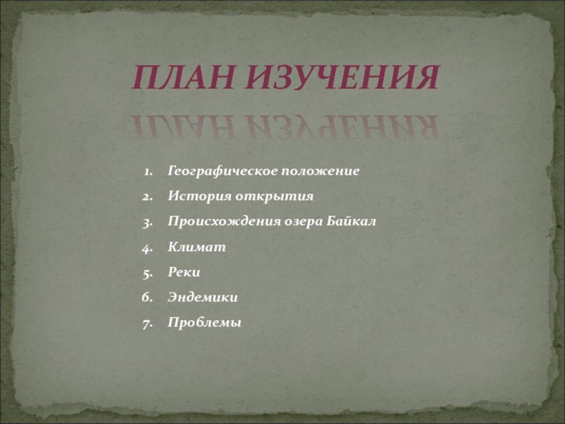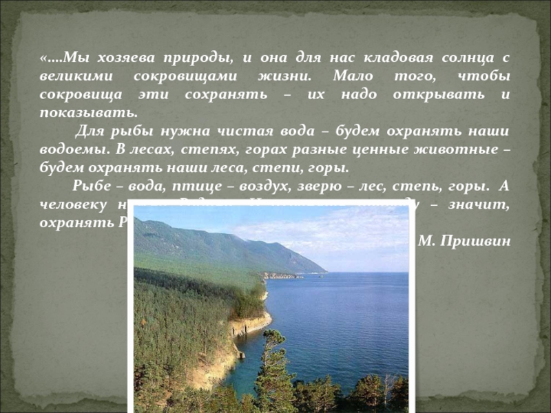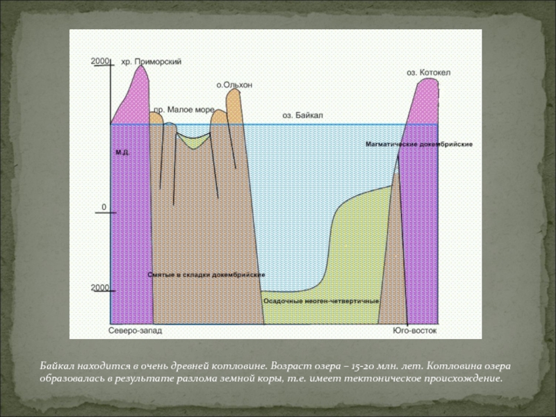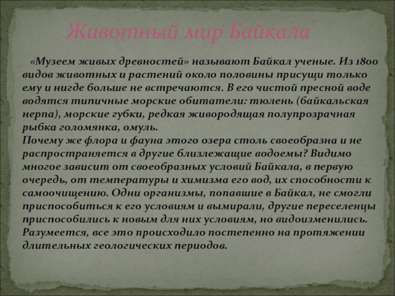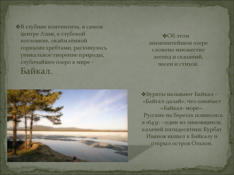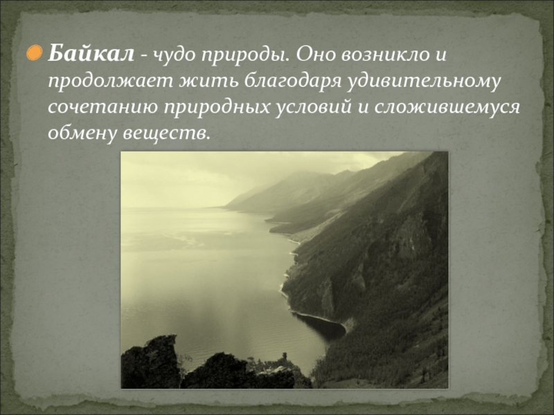 В глубине континента, в самом центре Азии, в глубокой котловине, окаймлённой горными хребтами, раскинулось уникальное творение природы, глубочайшее озеро в мире - Байкал.