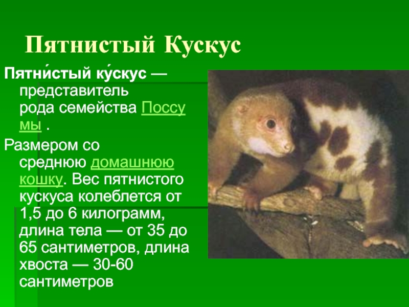 Размером со среднюю домашнюю кошку. Вес пятнистого кускуса