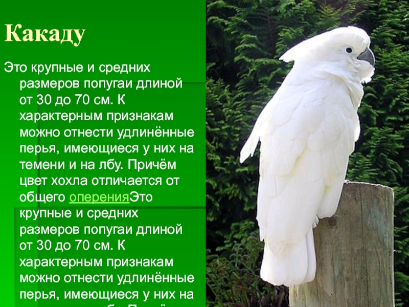 см. К характерным признакам можно отнести удлинённые перья, имеющиеся у них на темени и на лбу. Причём цвет хохла отличается от общего оперенияЭто крупные и средних размеров попугаи длиной от 30 до 70 см. К характерным признакам можно отнести удлинённые перья, имеющиеся у них на темени и на лбу. Причём цвет хохла отличается от общего оперения. Их окраска состоит из белых, чёрных, розовых и жёлтых тонов.