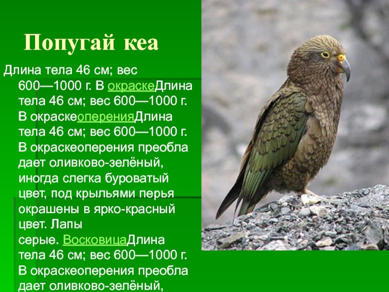 см; вес 600—1000 г. В окраскеоперенияДлина тела 46 см; вес 600—1000 г. В окраскеоперения преобладает оливково-зелёный, иногда слегка буроватый цвет, под крыльями перья окрашены в ярко-красный цвет. Лапы серые. ВосковицаДлина тела 46 см; вес 600—1000 г. В окраскеоперения преобладает оливково-зелёный, иногда слегка буроватый цвет, под крыльями перья окрашены в ярко-красный цвет. Лапы серые. Восковица и радужкаДлина тела 46 см; вес 600—1000 г. В окраскеоперения преобладает оливково-зелёный, иногда слегка буроватый цвет, под крыльями перья окрашены в ярко-красный цвет. Лапы серые. Восковица и радужка тёмно-серые.Клюв тёмно-серый, сильно загнутый, надклювье длинное. Имя попугай получил из-за громкого крика: «кеее-аа».