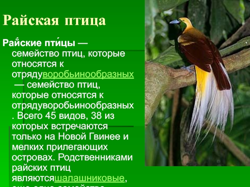 которые относятся к отрядуворобьинообразных. Всего 45 видов, 38 из которых встречаются только на Новой Гвинее и мелких прилегающих островах. Родственниками райских птиц являютсяшалашниковые, еще одно семейство похожих птиц.