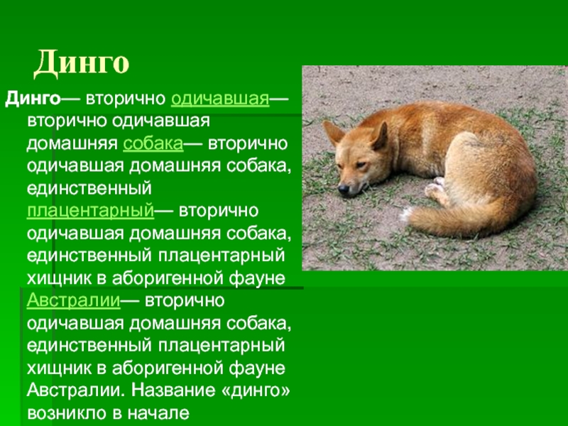 единственный плацентарный— вторично одичавшая домашняя собака, единственный плацентарный хищник в аборигенной фауне Австралии— вторично одичавшая домашняя собака, единственный плацентарный хищник в аборигенной фауне Австралии. Название «динго» возникло в начале европейской колонизации Нового Южного Уэльса— вторично одичавшая домашняя собака, единственный плацентарный хищник в аборигенной фауне Австралии. Название «динго» возникло в начале европейской колонизации Нового Южного Уэльса и, по всей вероятности, происходит от «тинго» — термина, использовавшегося аборигенами Порт-Джексона для описания своих собак