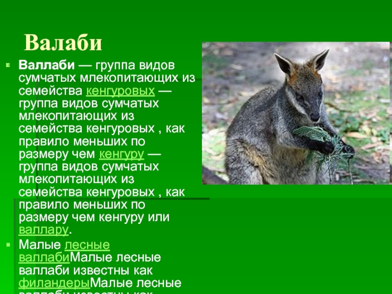 млекопитающих из семейства кенгуровых , как правило меньших по размеру чем кенгуру — группа видов сумчатых млекопитающих из семейства кенгуровых , как правило меньших по размеру чем кенгуру или валлару.