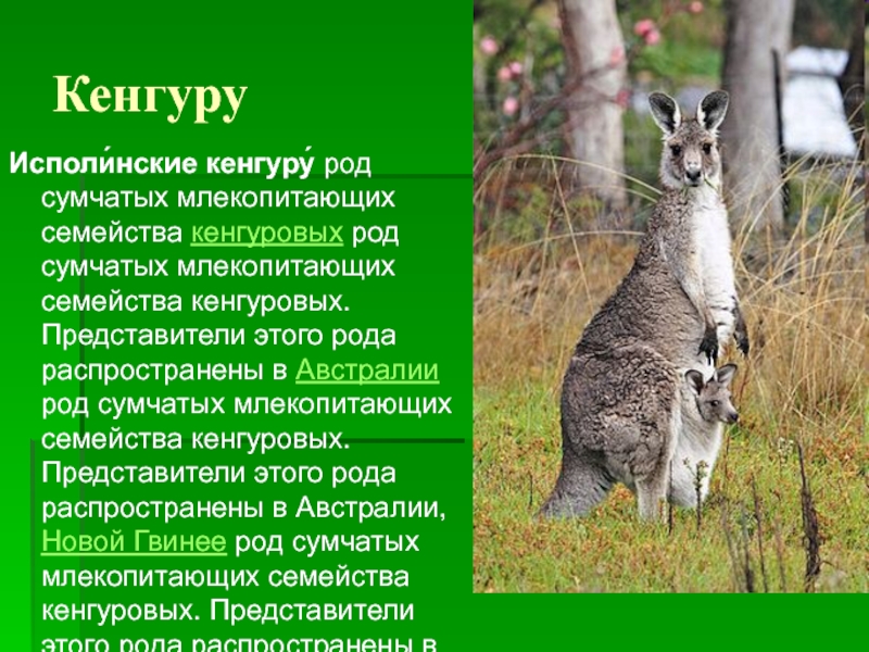 Исполи́нские кенгуру́ род сумчатых млекопитающих семейства кенгуровых род сумчатых млекопитающих семейства