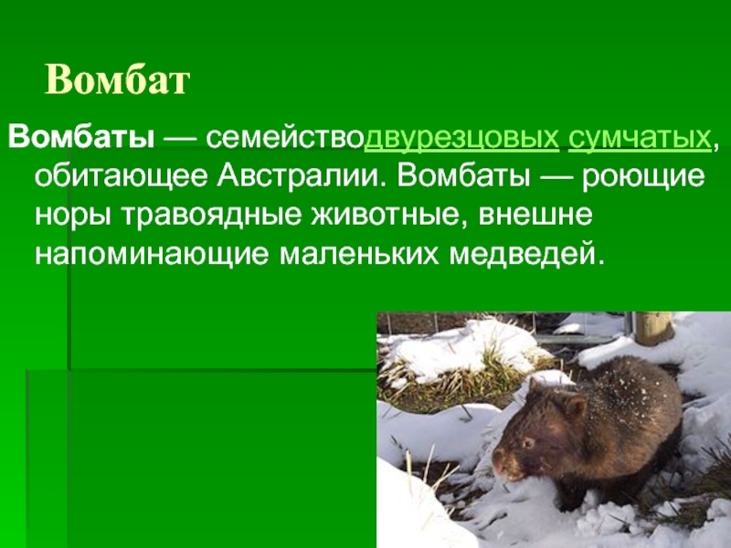 Вомбаты — семействодвурезцовых сумчатых, обитающее Австралии. Вомбаты — роющие норы травоядные животные, внешне