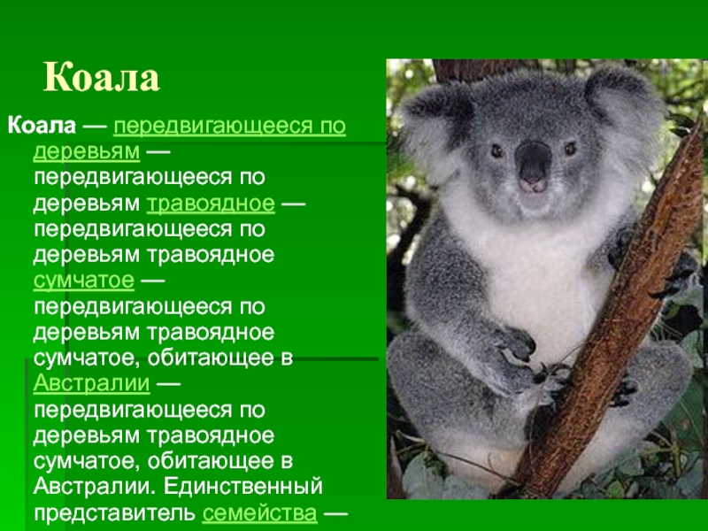 травоядное сумчатое — передвигающееся по деревьям травоядное сумчатое, обитающее в Австралии — передвигающееся по деревьям травоядное сумчатое, обитающее в Австралии. Единственный представитель семейства — передвигающееся по деревьям травоядное сумчатое, обитающее в Австралии. Единственный представитель семейства Коаловыеангл..