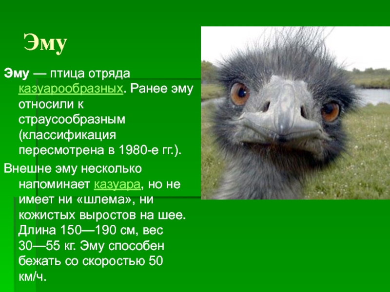 Эму — птица отряда казуарообразных. Ранее эму относили к страусообразным (классификация пересмотрена