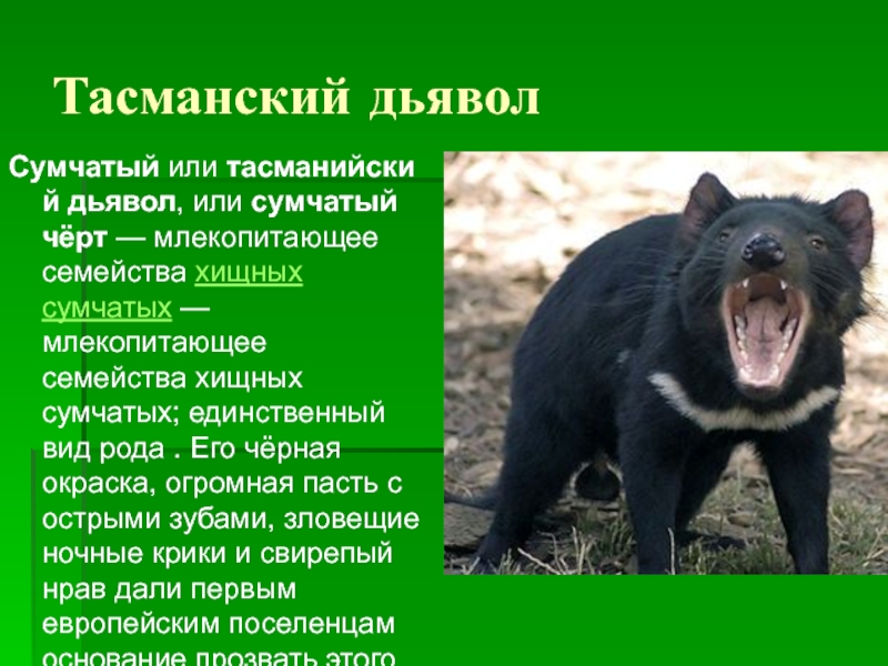 сумчатых; единственный вид рода . Его чёрная окраска, огромная пасть с острыми зубами, зловещие ночные крики и свирепый нрав дали первым европейским поселенцам основание прозвать этого коренастого хищника «дьяволом».