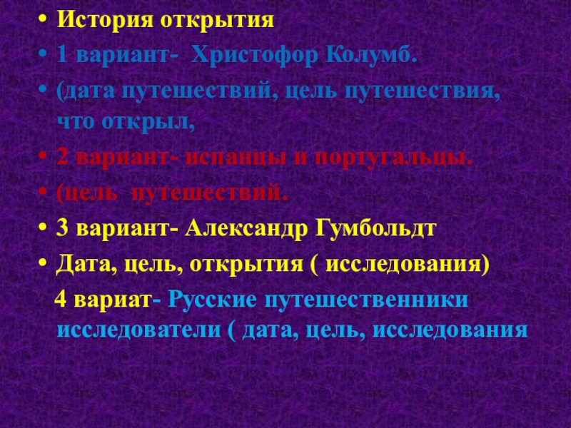 История открытия1 вариант- Христофор Колумб.(дата путешествий, цель путешествия, что открыл, 2 вариант- испанцы и португальцы.(цель путешествий.3 вариант-