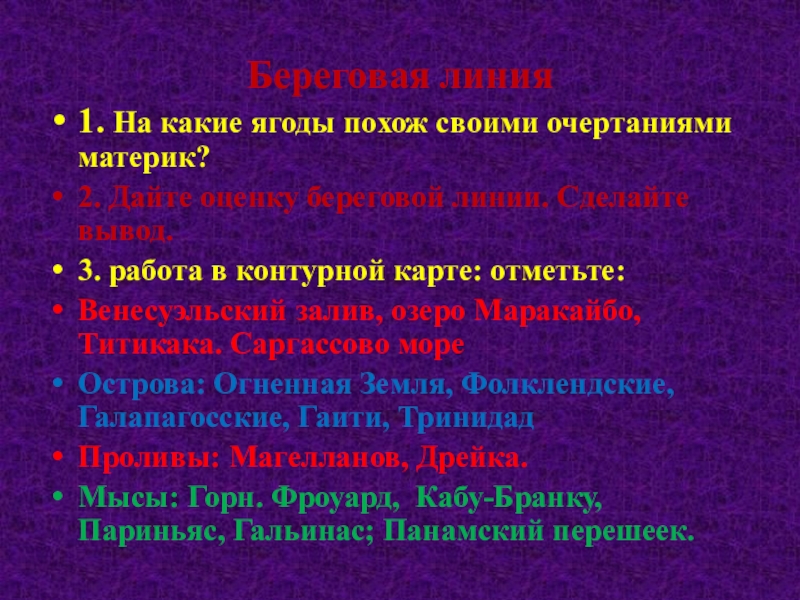 Береговая линия1. На какие ягоды похож своими очертаниями материк?2. Дайте оценку береговой линии. Сделайте вывод.3. работа в
