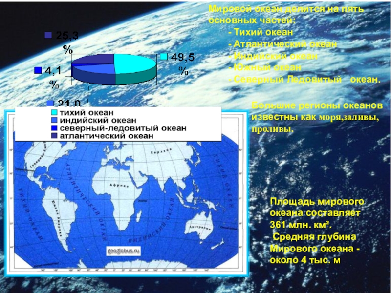 ¾ поверхности планеты покрыто сплошной пеленой воды – океанами и морями – и лишь немногим более ¼ остается на долю суши.