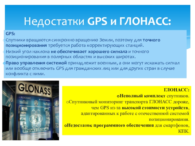 Спутниковый мониторинг транспорта ГЛОНАСС дороже, чем GPS из-за высокой стоимости устройств, адаптированных к работе с отечественной системой позиционирования.